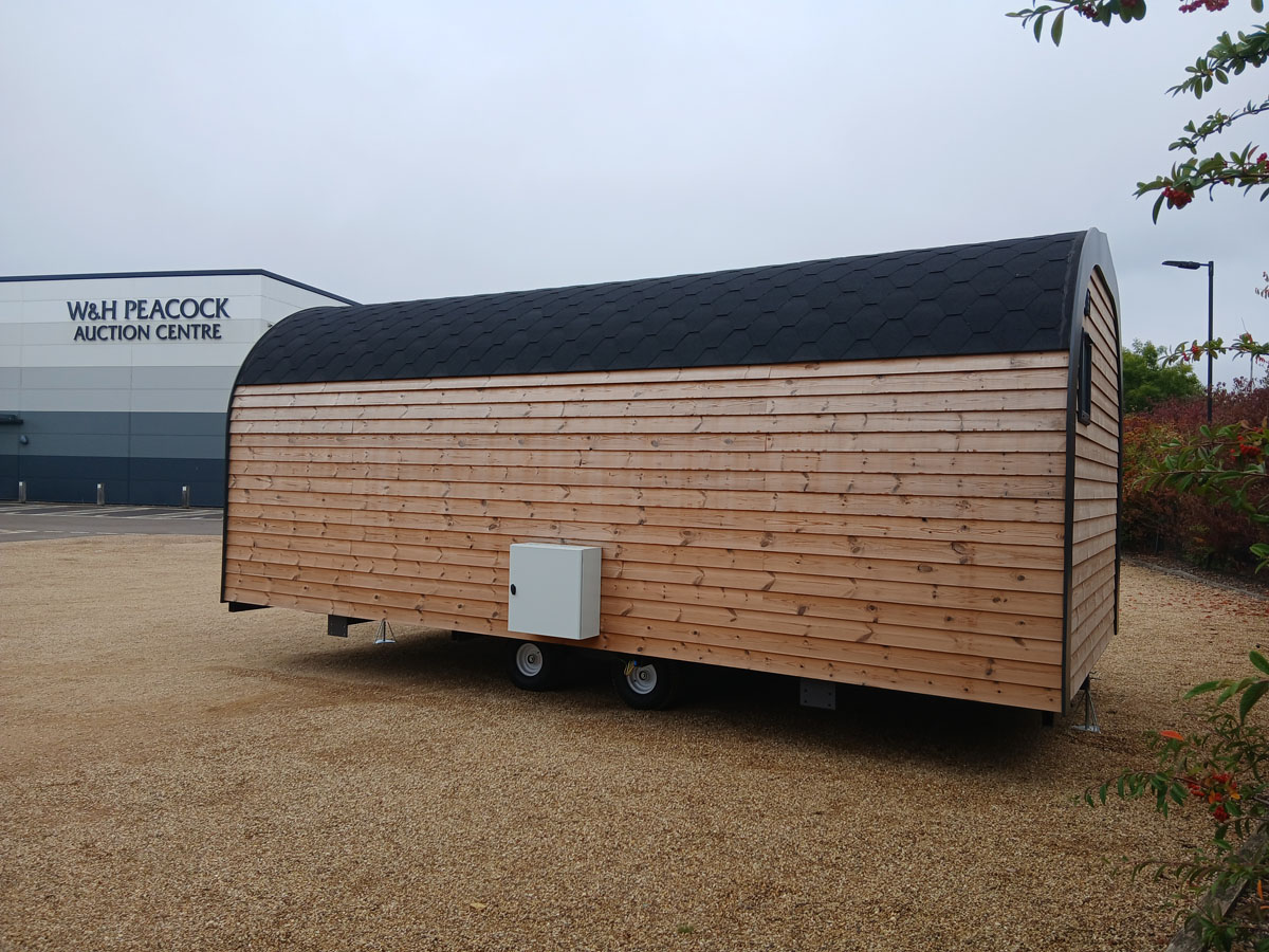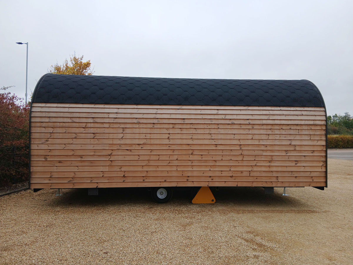 External measurements 3.6m wide (excluding consumer unit) x 3.5m tall (from ground to top as is its sits on wheels) x 6.9m long